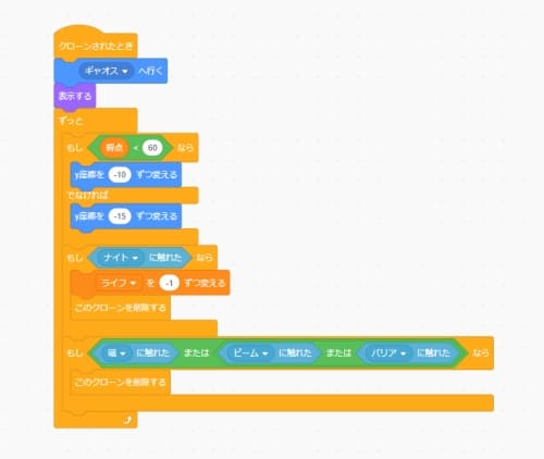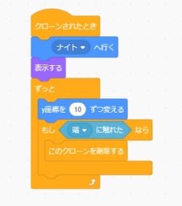 3)ナイトの攻撃「ビーム」に触れたら消える。変数「得点」を「1」増やす。上の場所に戻る。