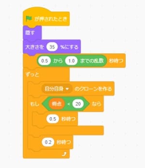 - クローンは、0.2秒間隔で作る(ゲームを面白くするために変数「得点」が20以下の時は0.2秒間隔にしてみよう)